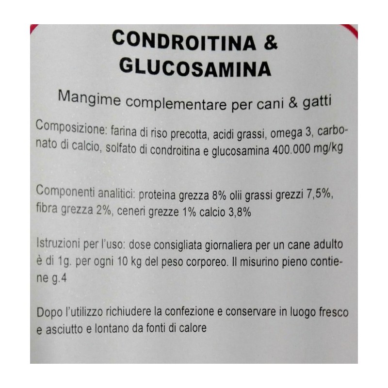 Mangime complementare per cani e gatti raccomandato per problemi articolari, il Condroitin solfato e la Glucosamina aiutano a rallentare la degenerazione articolare.