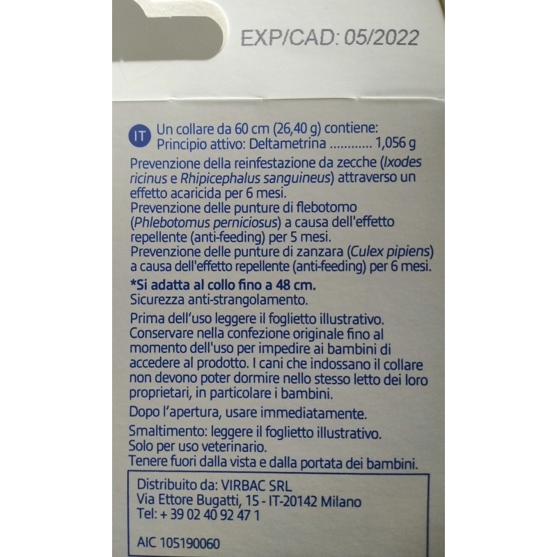 N° 01 Collare da 60 cm. Contiene 1,056 g di Deltametrina per collare.