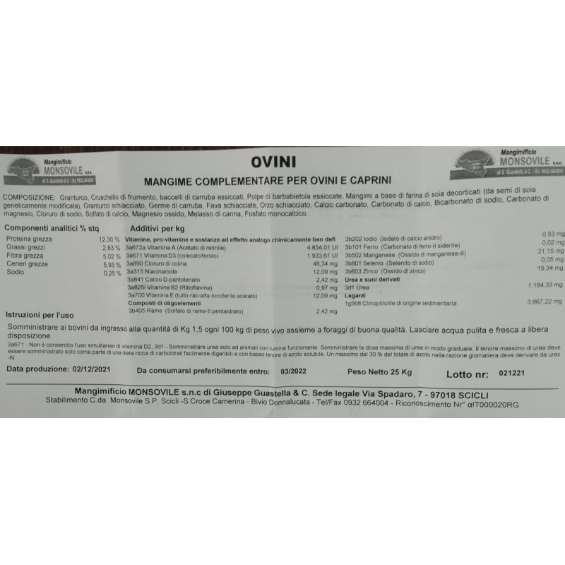 Mangime complemetare per ovini e caprini 25kg.