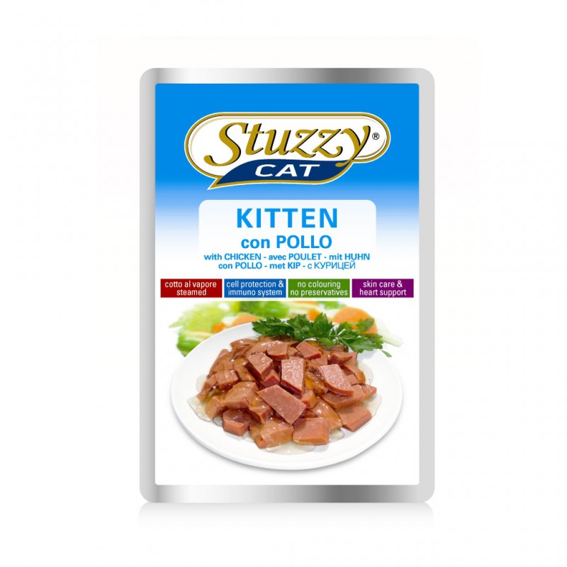 Stuzzy Cat Kitten Con Pollo, è un alimento umido completo per gattini.