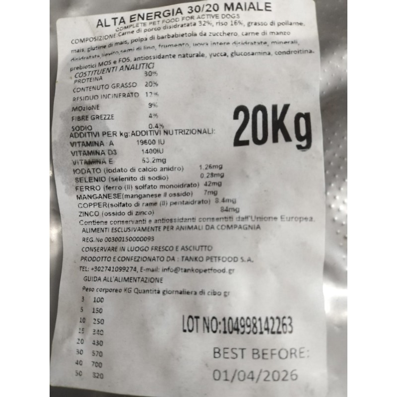 Questi valori indicano un alimento altamente energetico, con un buon contenuto proteico e lipidico, adatto a cani con elevato dispendio fisico.