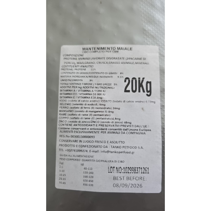 COMPOSIZIONE: Proteine animali lavorate e disidratate (24% carne di maiale), mais, grano, crusca, grasso animale, minerali.