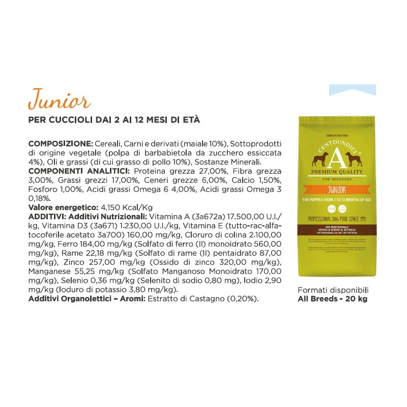 Proteina grezza 27,00%, Fibre grezze 3,00%, Grassi grezzi 17,00%, Ceneri grezze 6,00%, Calcio 1,50%, Fosforo 1,00%, Acidi grassi Omega 6 4,00%, Acidi grassi Omega 3 0,18%.